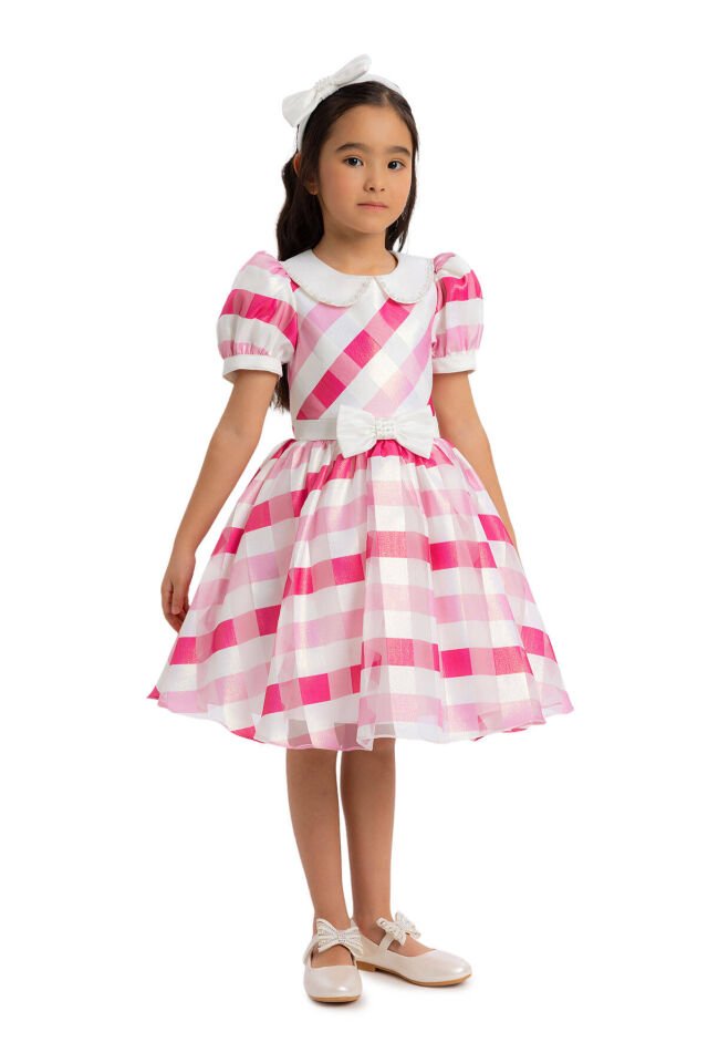 Ekose desenli fuşya elbisemiz, karpuz kol manşetleri ve inci düğmeleriyle oldukça göz alıcı. Nakış detaylı bebe yaka ve bel kısmındaki inci süslemeli mini fiyonk kemer, elbiseye sevimlilik katıyor. Büzgülü beli ve hacimli eteği ile retro bir hava taşıyan elbise, fiyonk saç aksesuarı ile tamamlanıyor. %100 pamuk astarı sayesinde rahat ve sağlıklı bir kullanım sunar. Doğum günü, parti veya özel günler için şık ve sevimli bir tercih.