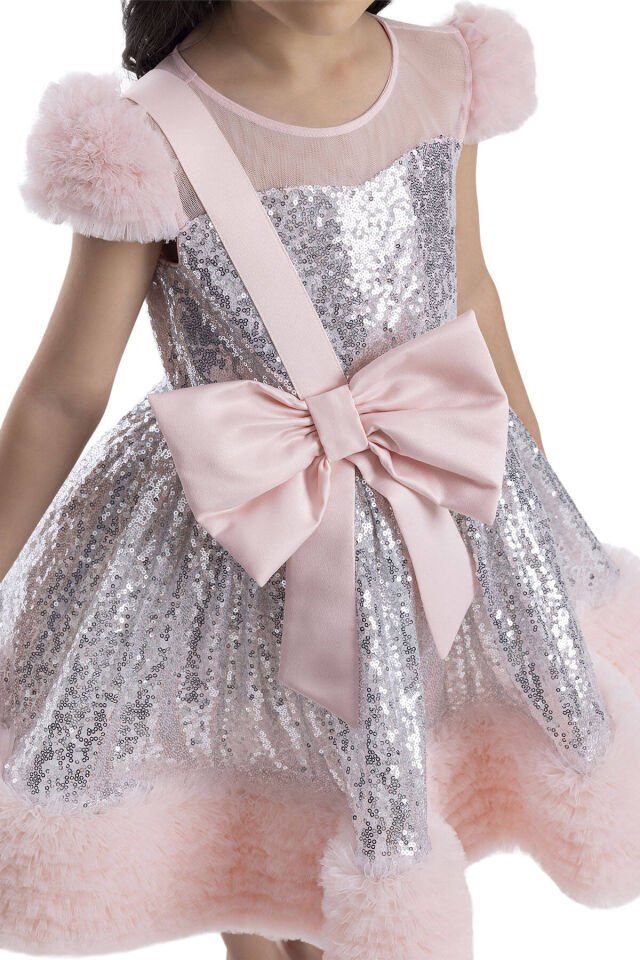 Fırfırlı kısa kollu elbise, transparan tül kumaşıyla zarif bir tasarım sunar. Kalp yaka kesimiyle dikkat çeken model, yaka kısmından etek ucuna kadar uzanan payetli kumaşıyla sezonun en ışıltılı parçalarından biridir. Omuzdan bele kadar uzanan saten şerit, üzerindeki büyük fiyonk detayıyla elbiseye şıklık katar. Etek ucundaki kabarık fırfırlar canlı ve enerjik bir stil yaratırken, iç kısımdaki dokulu tül katmanlar eteğe hacim kazandırır. %100 pamuk astarı sayesinde rahat ve sağlıklı bir kullanım sağlar. Doğum günü, parti ya da özel günlerde tercih edilebilecek şık bir seçenektir.
