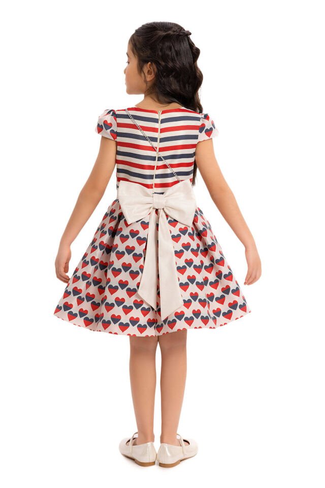 Ay kol detaylarıyla zarif bir görünüm sunan bu özel tasarım elbise, üst kısmındaki çizgili kumaş rozet ve verev kesim detayıyla farklı ve dikkat çekici bir stil yaratır. Pileli eteklerde kullanılan kalp desenli kumaş, neşeli ve çocuklara hitap eden enerjik bir hava katarken, elbiseye eşlik eden kalp şekilli çanta aksesuarı tasarımı tamamlar.