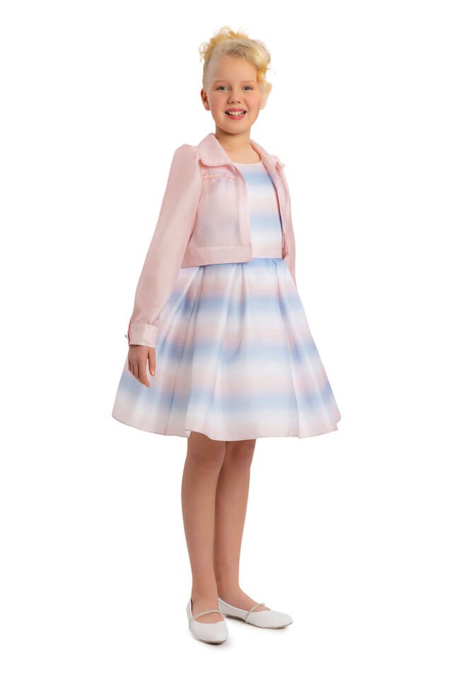 Kız çocuk modasında fark yaratan bu özel Pamina tasarımı, kot ceket stilinde yorumlanan organze ceket ve çizgili elbiseden oluşan zarif bir ikiliyle geliyor. Kol üstlerinde toplanan detaylarla şık bir silüet oluşturan organze ceket, yaka ve kurdele süslemeleriyle çocuğunuzun stiline modern bir dokunuş katarken zarif duruşuyla göz kamaştırıyor.